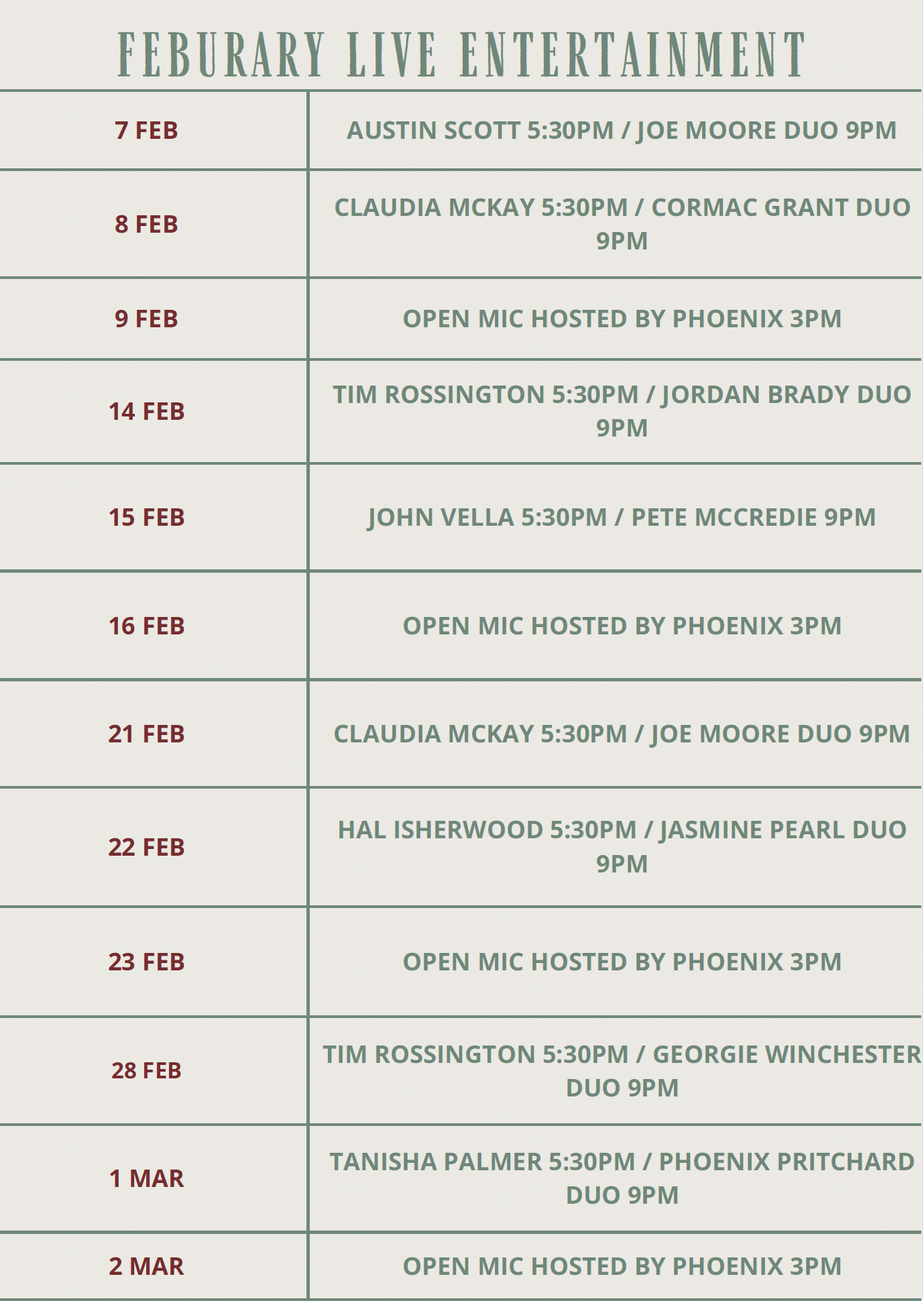 Join us every Friday, Saturday and Sunday for local legends and talented newcomers.